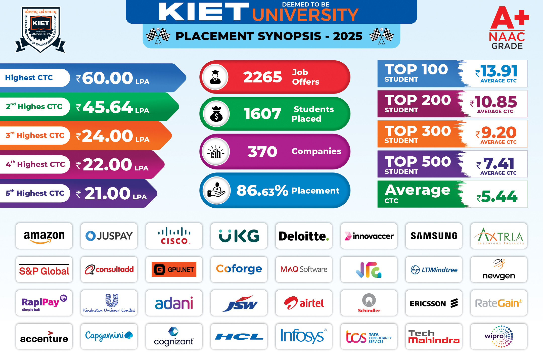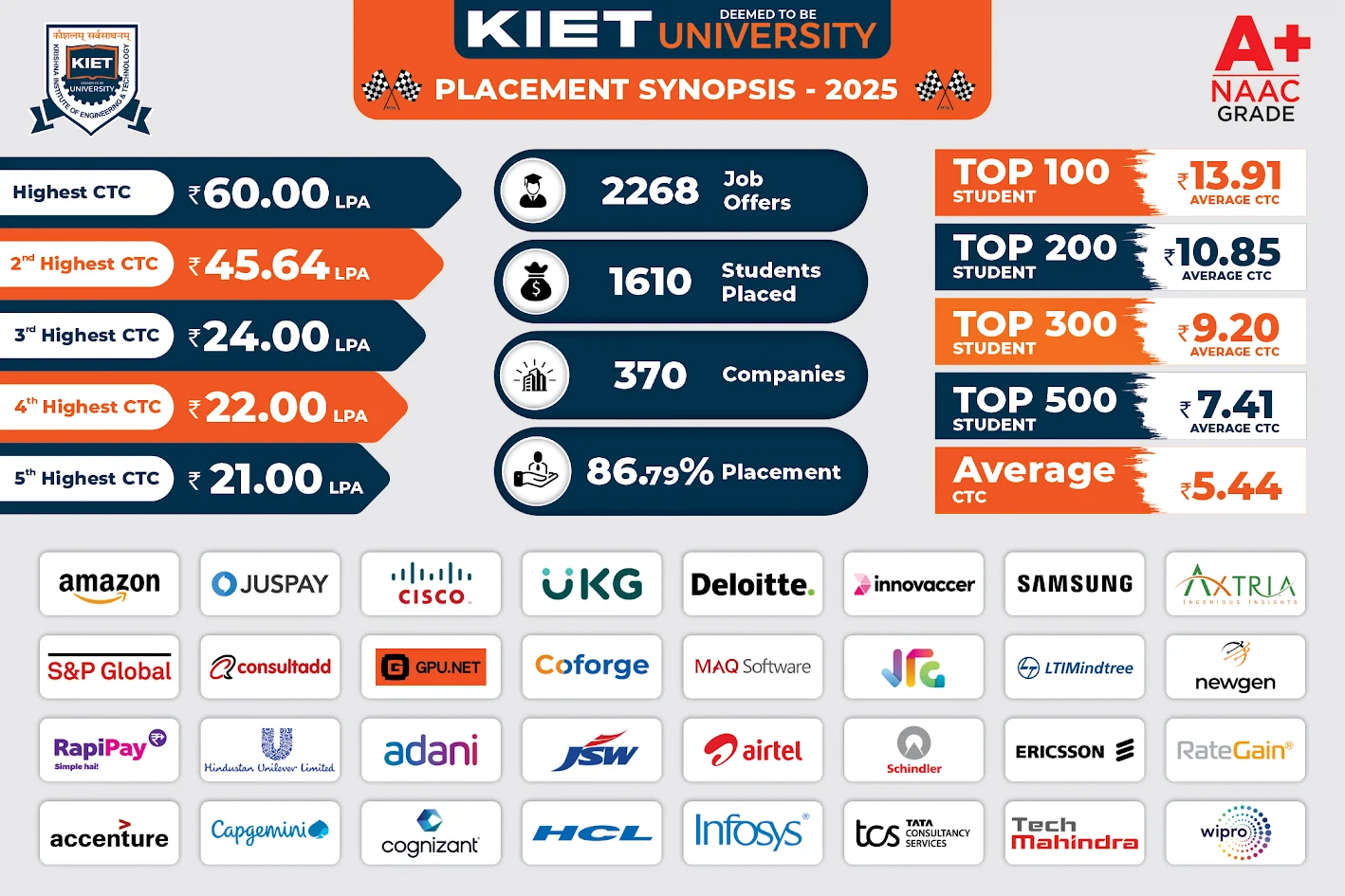 Each year, the institute welcomes an increasing number of recruiting organizations, offering opportunities across sectors such as technology, core engineering, consulting, research, and business roles. The consistent rise in both premium and mid-range offers reflects students’ growing competitiveness and alignment with industry needs. Multinational companies offering high-value roles continue to expand their presence, further validating the quality of talent nurtured at KIET.