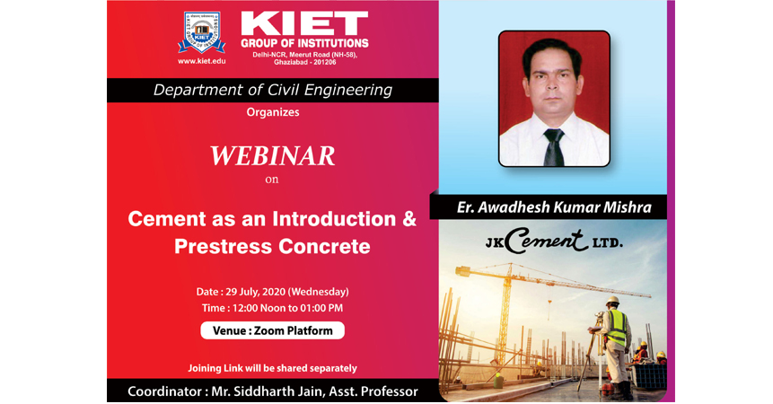 Department of Civil Engineering, KIET Group of Institutions, Ghaziabad organised a webinar on "Cement as an Introduction & Prestress concrete" on 29 July, 2020 from 12:00 Noon to 01:00 PM.The speaker of webinar was Er. Awadhesh Kumar Mishra (State Head CTS-Grey-UP/Uttarakhand, JK Cement Ltd.) The webinar was open for all the Civil Engineering fraternity including students, faculties and industry professionals. Attendees will get the certificate of participation on behalf of JK Cement Ltd.